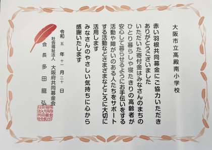 大阪府共同募金会より、赤い羽根募金の感謝状が届きました。ご協力いただきありがとうございました。