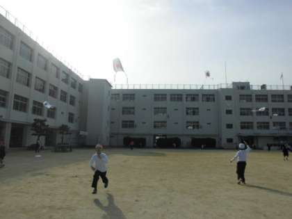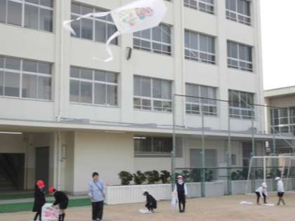 本日、1年生がたこあげをしました。始めはうまく上がらなかった児童も、先生の「(たこが)少し上がってきたらたこ糸を伸ばす。下がってきたらたこ糸を引く。」を実践し、楽しく遊んでいました。