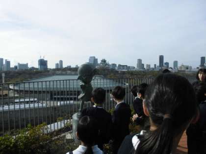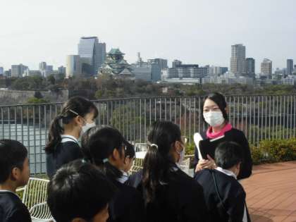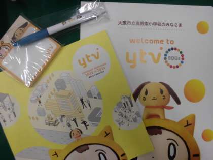 本日、5年生が社会見学に行きました。まず始めは読売テレビです。普段は入ることができないスタジオでテレビ番組の打合せを見せてもらったり、眺めのいい屋外の場所でテレビ局のお仕事について教えてもらったりしました。よく見るテレビアニメのキャラクターの像があって、子どもたちは大興奮でした。