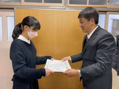 「第12回 伝え合おういのちのつながり」の作文に児童が応募したところ本校の5年生児童が最優秀賞に選ばれました。昨日授賞式が行われ、本日朝礼でお披露目をしました。