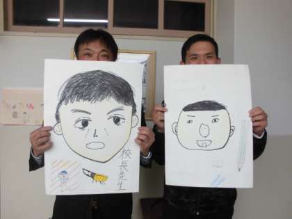1年間お世話になったたてわり班担当の先生方と、校長先生、教頭先生の似顔絵を班ごとに描きました。