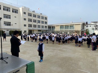 今日は、入学してきた1年生も一緒に、初めて、全校児童での朝会を行いました。。