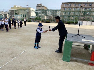朝会のはじめに作文で警察から表彰をうけた2年生児童を改めてみんなの前で紹介し、表彰をしました。