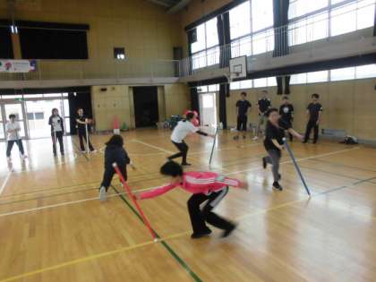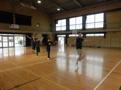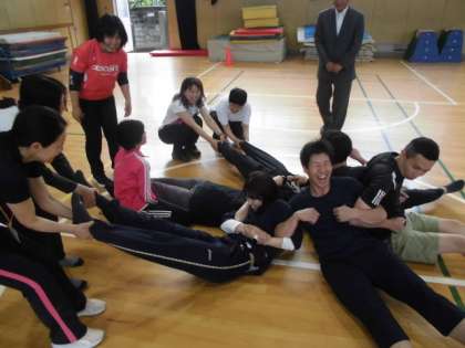 体育館では、子どもたちが楽しめる準備運動や主運動につながる動きや楽しみながらできる動きなど、様々な運動を実際に先生たちが体験しました。
