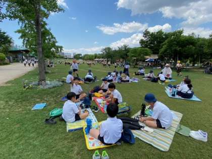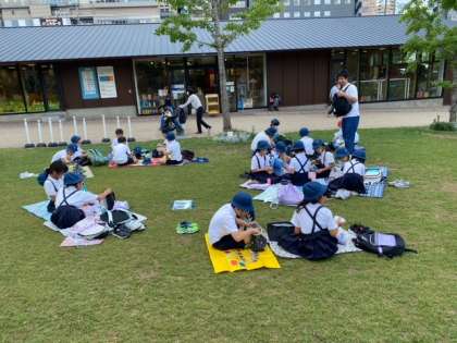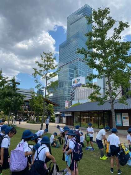 ハルカスを見上げる天芝で、みんなでお昼ごはんを食べました