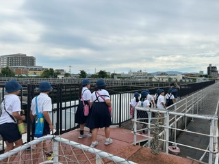 見学がスタートしました。先にアニメーションで仕組みを見たので、実際の物を見てもイメージしやすいです。「動いてる」、「回ってる」と子どもたちが話してます。