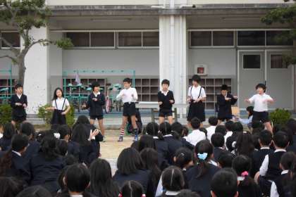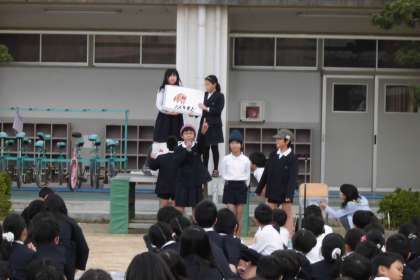 講堂が工事中なので、運動場で児童集会をしました。5組とは、マリオ