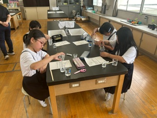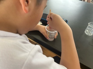 6時間目に科学クラブが、スライムを作っていました。薬品を少しずつ調合しながらかき混ぜます。それぞれ好きな色をつけて、できあがり。手を上にのせると歓声があがりました。スライムをやりたいために、科学クラブに入った子がいるくらい、スライムは人気です。