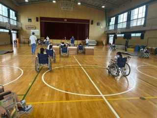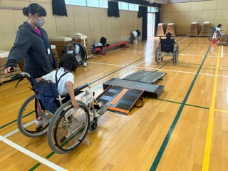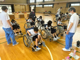 今日は、3年生が車椅子の体験をしました。普段何気なく歩いている道も、目線が下がると見えづらくなったり、少しの段差が乗り越えられないことに気づきました。