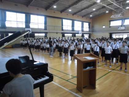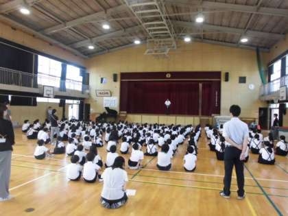 みんなで校歌を歌い、校長先生や生活指導の先生のお話を聞きました。