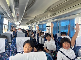 中国自動車道が大渋滞です。でも、車内はバス内レクリェーションで大盛り上がりです。今晩、キャンプファイヤーで歌う歌も練習しました。