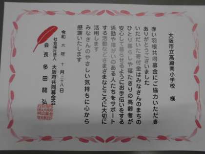 本日、大阪府共同募金会より、赤い羽根共同募金にかかる感謝状が届きました。ご協力ありがとうございました。