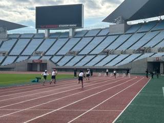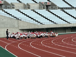 いよいよ始まりました。いつも走る50m走より長い、100m走です。ペースの配分も大切です。何よりみんな緊張してます。がんばれ!!