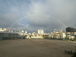 今日は、登校前に、大きな虹が校舎にかかりました。今日は大変寒いです。寒い日も増えてきます。標準服の長ズボンも増えてきましたが、体操服の長ズボンも少しずつ増えてきました。