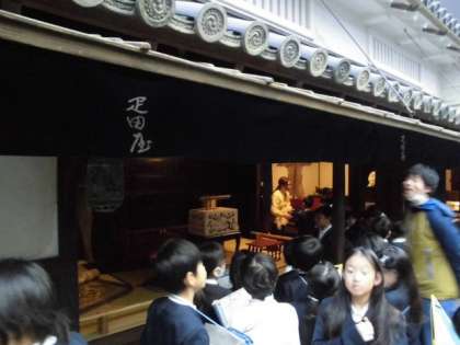 くらしの今昔館の中では、昔の町を再現したフロアも見学しました。「タイムスリップしたみたい〜」と子どもたちは、興味津々で学習していました。