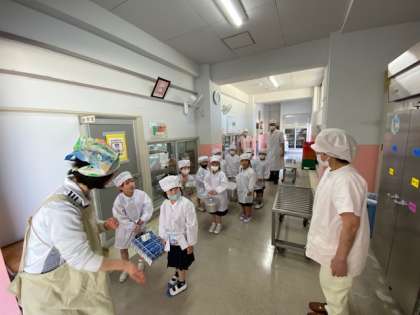 給食服に着替え、給食室にあいさつをして、給食を取りに行き、配膳も自分たちで。