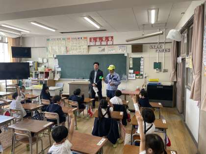 旭警察と区役所の方々が来校し、1年生に安全な登下校についてお話をしてくださいました。「知らない人には絶対についていかない」や「困ったことがあったら大きな声で助けをよぶ」など、1年生はどの子もうなずきながら真剣に話を聞いていました。