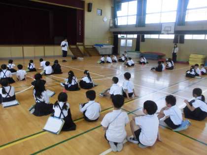 2年生が1年生の友だちと一緒に学校のいろいろなところを回り、案内したり紹介したりする学校探検がありました。