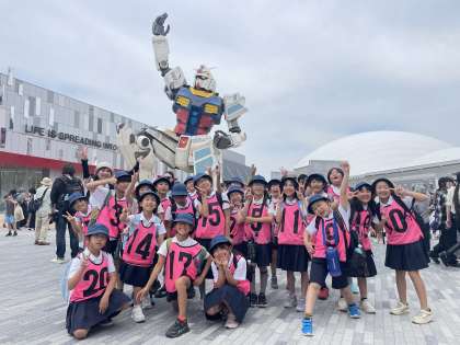 ガンダムの前で集合写真です。みんな大興奮です。