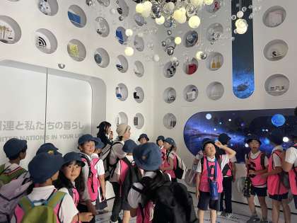 国連パビリオンのキラキラした展示に歓声をあげています。