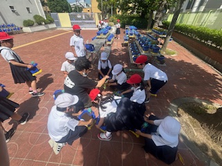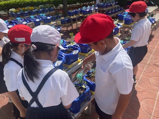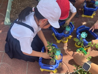 今日は2年生がミニトマトの苗を植えていました。ミニトマトを食べるのが苦手な子もいますが、毎年、自分が育てることで食べられるようになる子もいます。