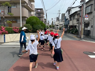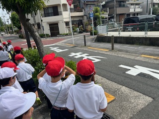 1年生が2時間目に校区を探検しました。安全に歩行するためのきまりを確認しました。通学路の標識や自転車の通路等、普段は気に留めていなかったこともしっかりと知りました。