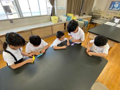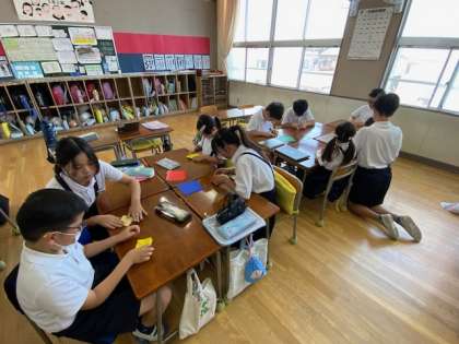 広島への修学旅行にむけて、原爆が落とされた日について、6年生が調べたことを班のみんなにわかりやすく話をしてくれました。そのあと、みんなで千羽鶴を降りました。6年生が中心となって、折り鶴をたくさんおりました。