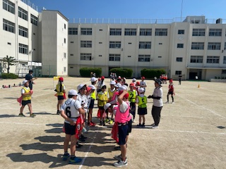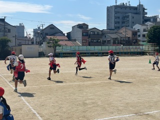 5年生が、体育で取り組んできたフラッグフットボールの集大成として、クラス対抗の交流戦を行いました。みんな負けまいと作戦をしっかり考え、精一杯走りました。大盛り上がりでした。