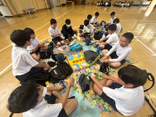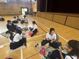 開演中は写真は撮れませんので、もう昼食です。国立文楽劇場の近くの学校の講堂をお借りしていただいています。みんな楽しみにしていた時間です。