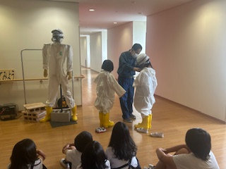 中央制御室の見学や化学防護服の試着、シアターでアニメーションの見学をしました。