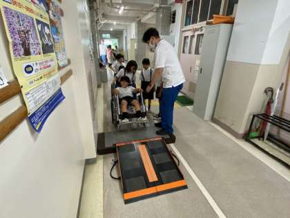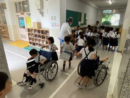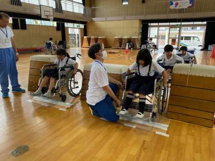 体育館での学習のあとは、校舎の廊下などを一般の道に見立てて車いすの介助体験をしました。ちょっとした段差や坂道がとても通りにくいことを実感できたり、町のバリアフリーの大切さについて肌で実感することができました。