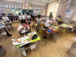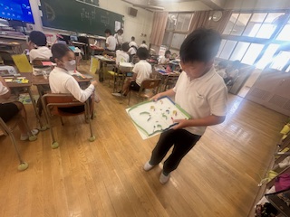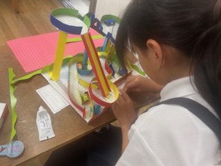 5年生が、ビー玉を転がして遊ぶ工作をしていました。迷路のような通路を作ったり、坂道を作ったり、二階建て、三階建てにしたりと、それぞれ工夫をしていました。私が行くと、いろいろ説明をしてくれて、「遊んでみて」と遊んでいる時に工夫を説明してくれました。