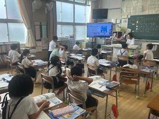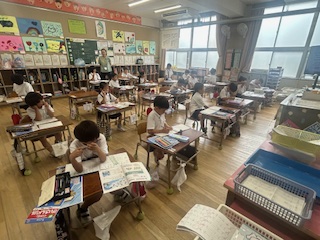 1年生が、算数で文章題の学習をしていました。足し算、引き算のどちらの問題なのか、線を引きながら言葉を手がかりに考えます。「合わせると」や「どちらが、何枚おおいですか」というところから考えます。一学期でずいぶんむずかしいことまでできるようになってきました。