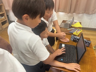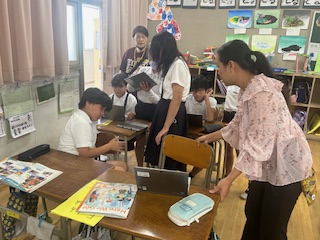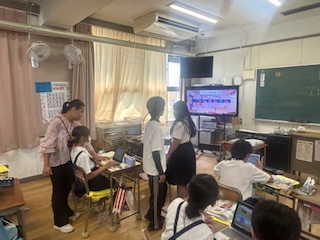 5年生が、ICT機器を使って、英語をしていました。ICT機器と英語は大変相性がいいです。なぜなら、私たちが英語を学んでた頃は、教科書を見ても、知らなければ、読み方や発音が分からなかったですが、今は、機器が全部読んでくれます。ですから、英語でICT機を使うのは大変有効と言えます。離れた席であっても、友だち同士、交流にも使っていました。