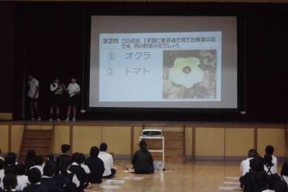 毎週木曜日は、児童集会があります。今日は、飼育栽培委員会の発表でした。飼育栽培に関するクイズが次々と出題されました。答えが出るたび、「イェィ!!」や「ウワーッ」と歓声が上がりました。その後、6年生の代表から、みんなから集まった鶴が3970羽になったことの報告があり、30羽を新たにつくって、きっちり4000にして、広島にもっていくと話がありました。
