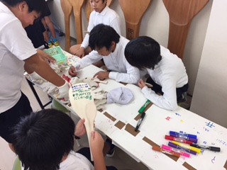 また、大きな「しゃもじ」にクラスごとに寄せ書きもしました。これもお土産として持って帰ります。