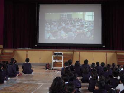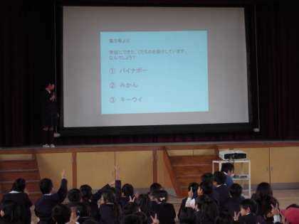 今日は、児童集会で新聞委員会が普段の取り組みを発表しました。ビデオで活動の様子を紹介したあと、今までの新聞に掲載されたものからのクイズでした。大変、盛り上がりました。