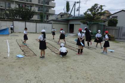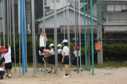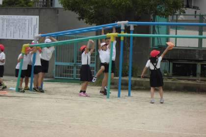 6月8日(木)ミナミンピックの紹介です。今日は、ラダーロープ、のぼり棒、うんていです。ラダーロープははしご状のロープを運動場に置き、リズミカルにジャンプします。両足で跳んだり片足で跳んだり前後に跳んだりして、いろいろな跳び方で跳びます。のぼり棒は、真ん中まで、一番上までなどのクリアがそれぞれあります。うんていは、一つずつ、一つとばしなどのクリア条件があります。みんな、順番を守ってしっかり取り組んでいました。