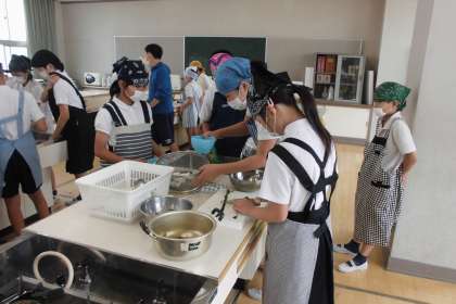 6月8日(木)3・4時間目に5年生が調理実習をしました。5年生になって初めてする家庭科の学習です。調理実習も初めてです。ゆで卵をしていました。つけ合わせにほうれん草をゆでて添えられていました。グループで楽しく調理していました。どのグループもきれいなゆで卵ができていました。盛り付けもグループそれぞれで工夫していて、おいしそうに仕上がっていましたよ。