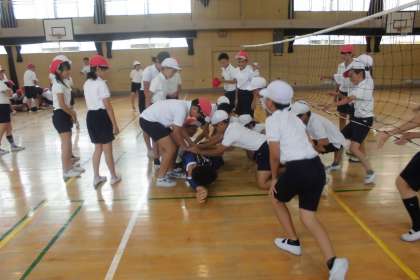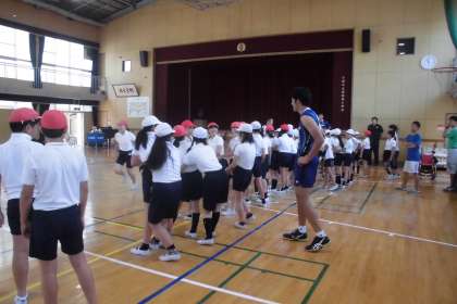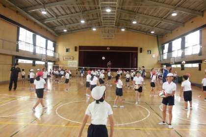 はじめは、力試しの運動をしたりボールになれる活動をしました。大人が見ても見上げるくらい背の高い選手のみなさんと体をいっぱい動かして楽しく運動することができました。後半は、コートを使って実際にバレーボールをしてみましたが、選手が打つボールの速さに、子どもたちは驚くばかりでした。普段の体育の授業とは、また違ったいい経験になったと思います。