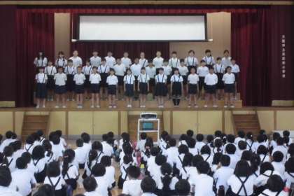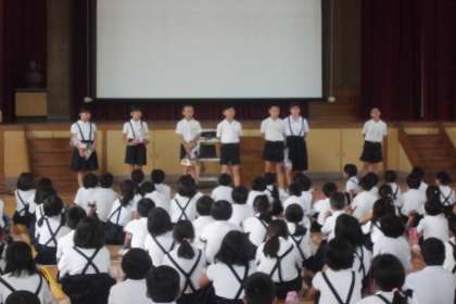 7月20日(木)終業式終了後、平和を願う集いをしました。本年度より、終業式に行うことになりました。平和学習を全校で行いました。校長先生のお話を聞いてから、6年生の平和学習の取り組みの発表がありました。とても立派な発表でした。その後、DVD「一つの花」を鑑賞しました。そして、全校児童で折った折鶴を6年生に渡しました。この折鶴は、全校での取り組みとして、学校を代表して6年生が修学旅行で広島に持っていきます。6年生も、1年生から5年生のみんなにしっかりと受け取りました!と代表としての自覚を持つことができました。戦争の悲惨さと二度と起こしてはいけないということをしっかりと心に刻んでほしいと思います。