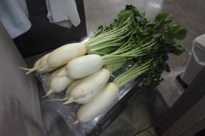 12月5日(火)今日の給食には、田辺だいこんが使われていました、田辺だいこんは大阪の伝統野菜の一つです。今日の給食には、白い部分は煮物に、葉の部分は味噌汁に使われていました。残すところなく大切に食材を使って調理していただいています。白い部分が短くて、葉の部分がとても長い、田辺だいこんの写真を給食室の入り口にはりました。