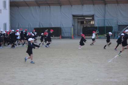 12月7日(木)の児童集会です。なわとび集会をしました。なかよしグループでかけ足跳びのリレーをしました。1年生も頑張って跳んでいました。上級生が下級生にやさしく声をかける姿も見られて、寒い日ではありましたがとても温かい気持ちになりました。