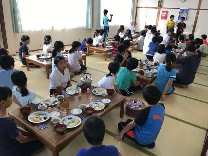 いよいよ、林間学習も最終日を迎えました。2日目の活動が盛りだくさんだったせいか、ぎりぎりまで寝ている子が多かったようです。朝の会(体操)の様子と朝食の様子です。今日の活動は半日足らずですが思い出をたくさん作ってほしいと思います。