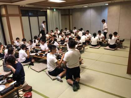宿舎に着いて開舎式をしました。その後、お風呂に入り、待ちに待った夕飯です。ボリューム満点でお腹いっぱいになりました。