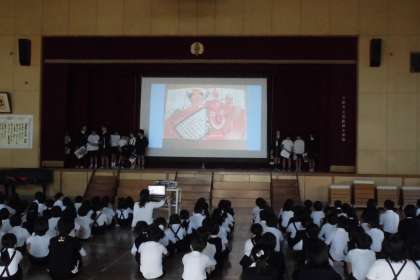 児童集会です。図書委員会の発表です。図書委員会の児童が読み聞かせをしました。「はしれ!やきにくん!」というお話でした。今週は読書週間です。たくさんの子どもたちが図書室に来ています。本に親しんでほしいと思います。