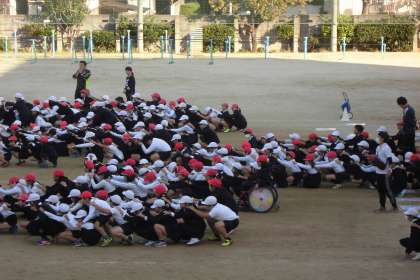 集会委員会のゲームです。「あひるの行列」というゲームです。前の人につかまって、しゃがんだまま前に進みます。その行列が切れてしまうとスタートからやり直し。切れてしまうグループもありました。切れるとスタートに戻り、みんなルールを守って最後までゴールすることができました。