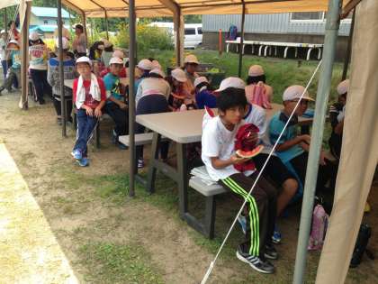 飯ごう炊さんの後はデザートのスイカを食べ、焼き板作りをしました。
