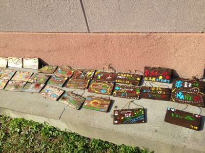 次にアクリル絵の具を使い板を装飾しました。家族や自分の名前を入れたり、山の絵を描くなどオリジナルの焼き板が完成しました。