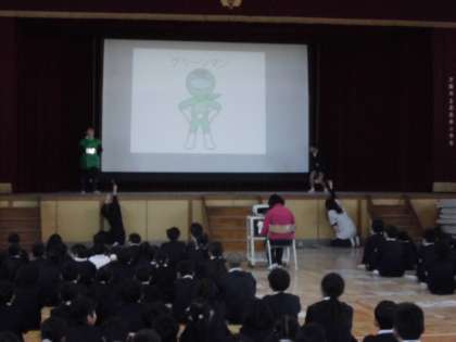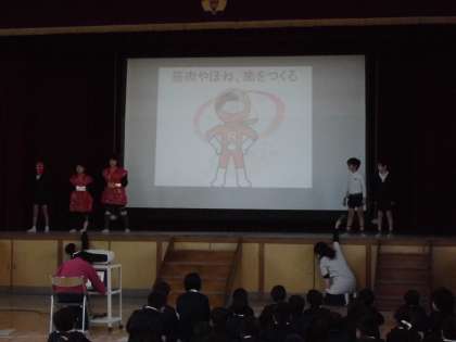 児童集会です。健康委員会の発表です。劇をしました。赤・黄・緑の食べ物をバランスよく食べようというテーマの劇でした。衣装もつけてわかりやすく台本が作られました。そして、給食調理員さんへの感謝の寄せ書きも紹介されました。給食調理員さんもきっと喜んでおられると思います。